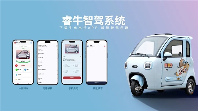 智能化方面,萌可M1搭载牛电最新睿牛智驾系统,下载“牛电出行”APP,能够实现无感解锁、一键寻车、一键启动、实时报警、门锁控制等多种智能化功能,方便又放心。